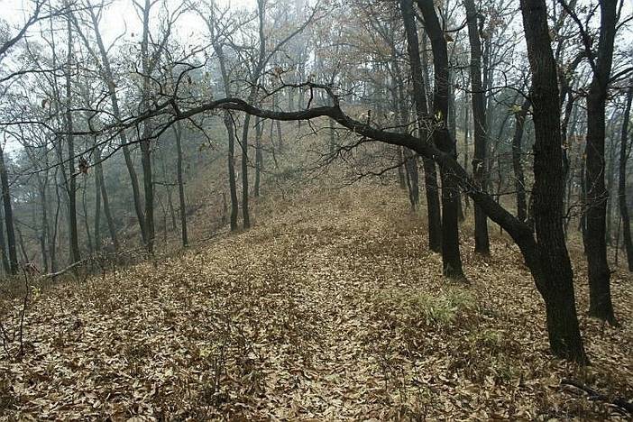 深秋时节,万树虬枝,光影斑驳,满地树叶厚如织毯。行走、安卧,沉浸在大自然里,可以体会轻松自在。